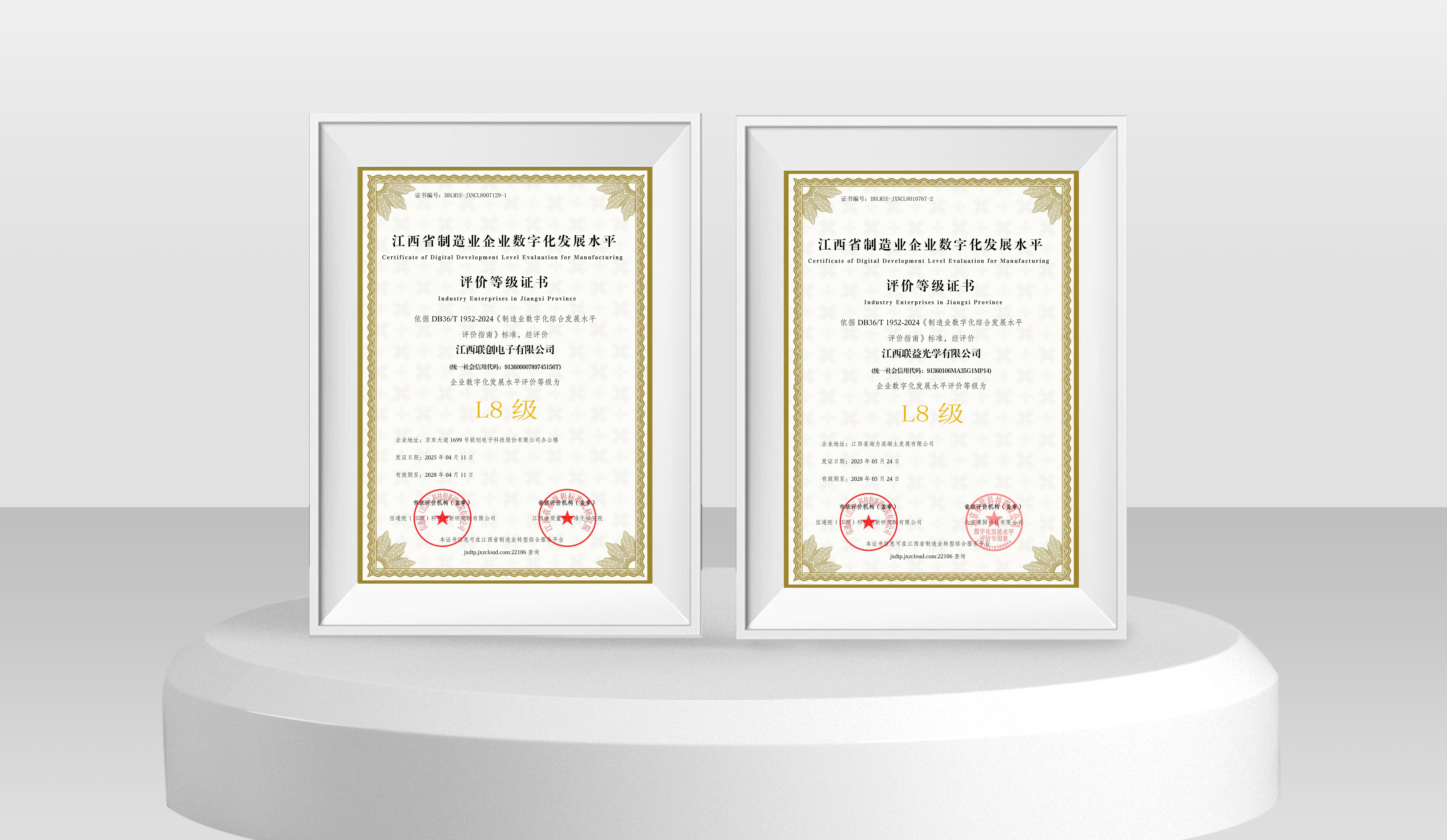 近日,联创电子科技股份有限公司旗下开云平台,开云KAIYUN(中国)(以下简称江西联创)与江西联益光学有限公司(以下简称江西联益)凭借深度集成与创新应用能力,在江西省制造业企业数字化发展水平等级评价中双双达到L8级水平,标志着两家企业在数字化转型领域已跻身全省“集成提升阶段”最高水平,为全省制造业智能化升级树立新标杆。